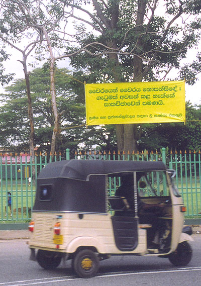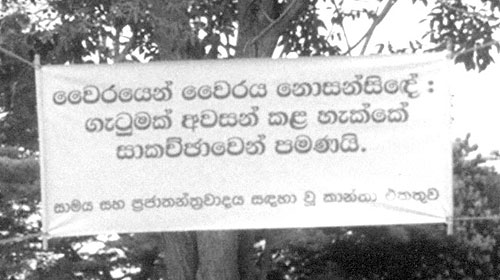 A banner campaign for the Vesak month was launched by the SLWPD, demanding an end to the war. All the slogans used were related to Buddhism, and 36 banners were designed in Sinhala. These banners were displayed near pandols (the lighted structure used for Vesak), famous temples and at major roundabouts in Colombo, Anuradhapura, Katunayake, Polonnaruwa and Galle.