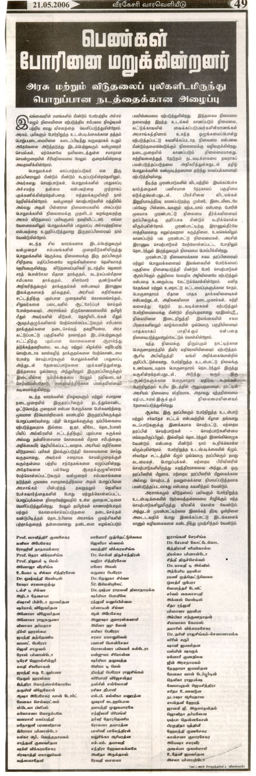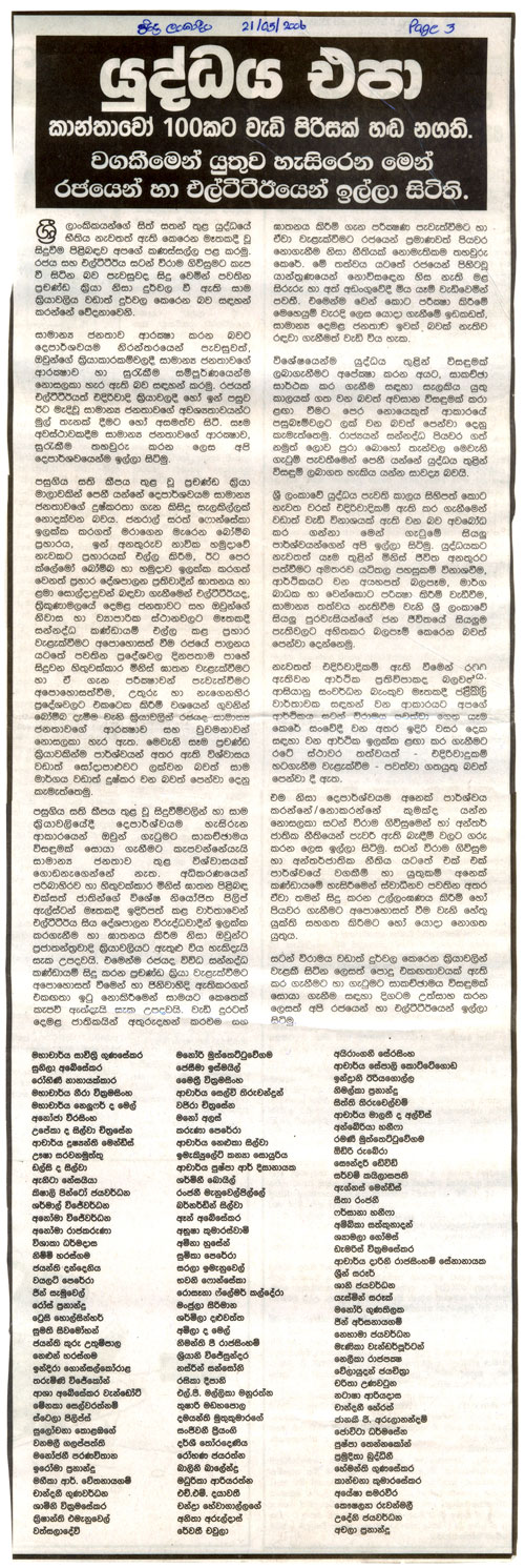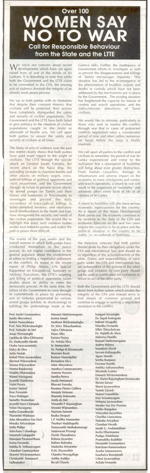 The WMC sent a statement to H.E. Mahinda Rajapakse, President of Sri Lanka, to the LTTE, the Inspetor General of Police and to the English, Sinhala and Tamil newspapers calling for responsible behaviour and an appeal to stop the killings on both sides, the government and the LTTE. This statement was sent together with 118 women’s signatures. The statement was published on 21st May in the Sri Lankan newspapers Sunday Times, Lankadeepa and Veerakesari and on the 24th May 2006 in the Daily News.